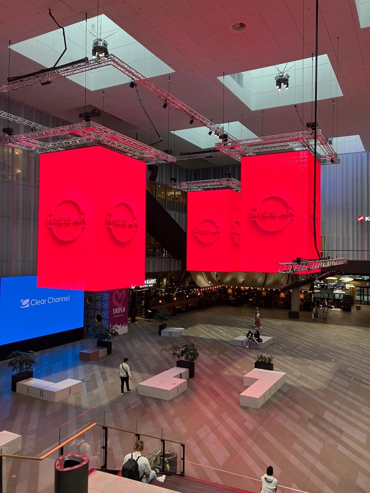 Yhteensä 168 neliötä LED-pintaa. Ratkaisuna katosta riiputettu verhomainen mesh-led P3.9 / P7.8 epäsymmetrinen led-näyttö.