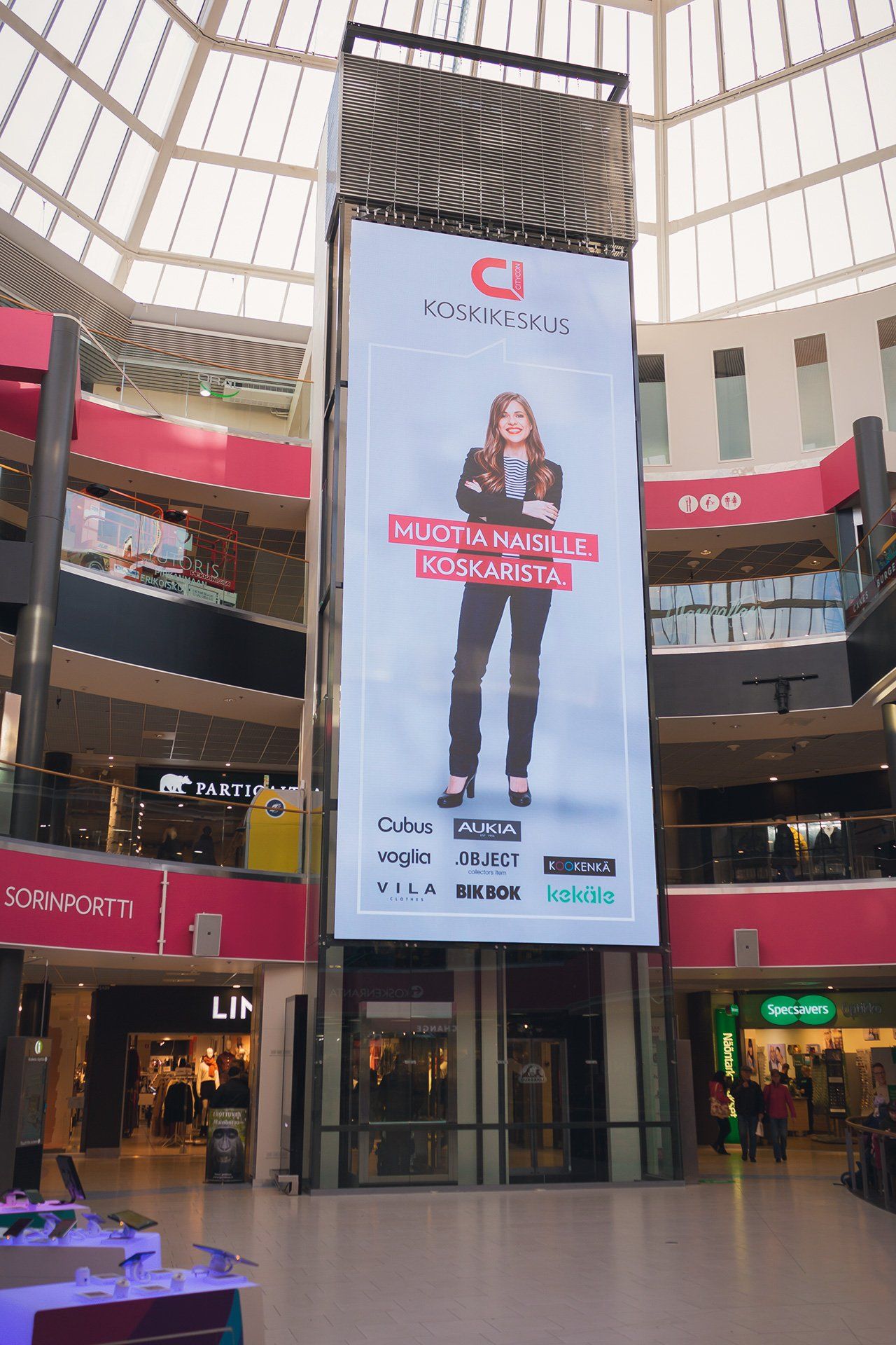 Yhtä komeasti loistaa myös Kauppakeskuksen hissikuilun mitoituksella luotu 12 metriä korkea ja lähes 6 metriä leveä sisänäyttö. LED-kokonaisuus on kiinnitetty lasisen pinnan eteen innovatiivisesti vaijereiden varaan ja se onkin tyyppiesimerkiksi siitä, miten taustamateriaali ei estä näyttävän rakennelman luomista!